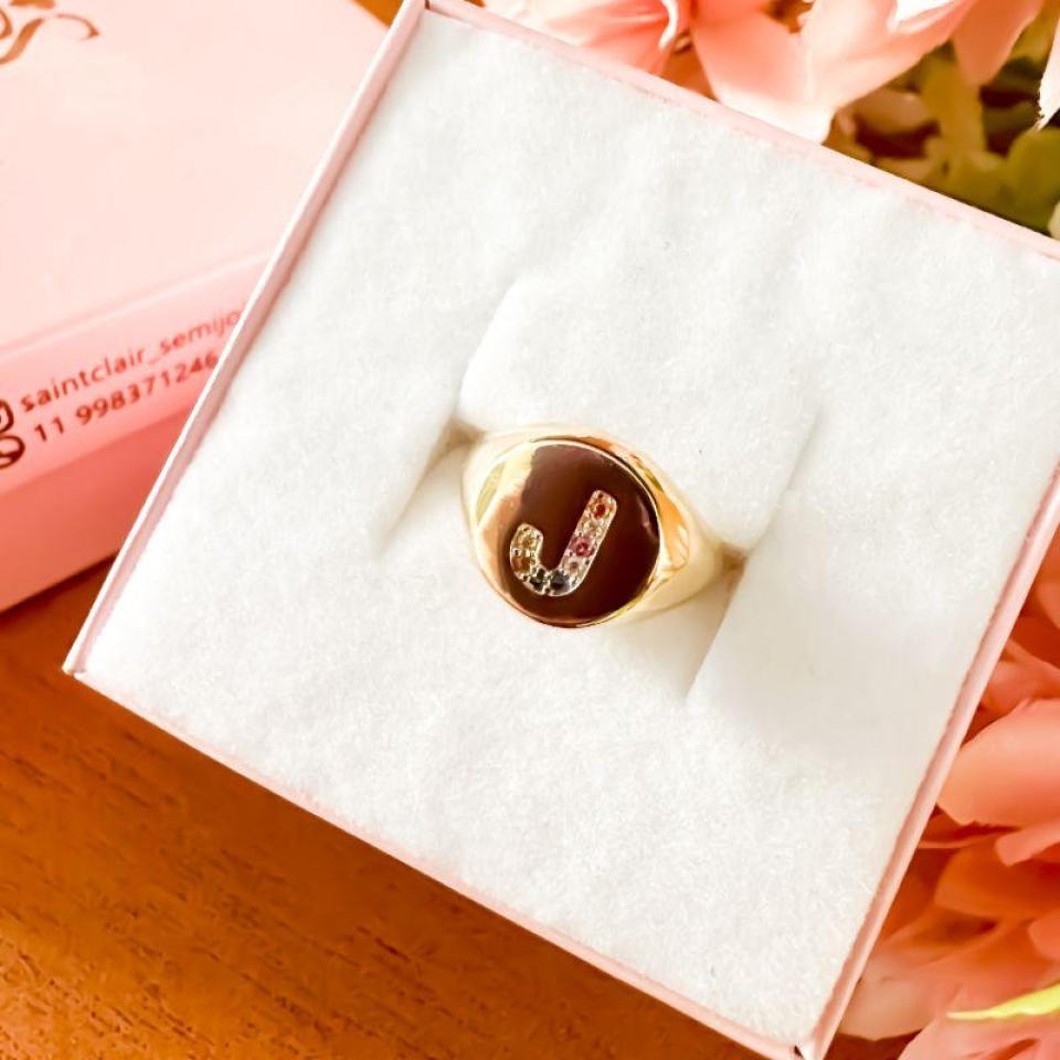 Anel sinete em metal com banho de ouro 18k, oferece um brilho intenso e longa durabilidade. A face do anel é redonda e polida trazendo no centro uma inicial cravejada, cuidadosamente com micro zircônias, que refletem a luz com delicadeza e sofisticação.