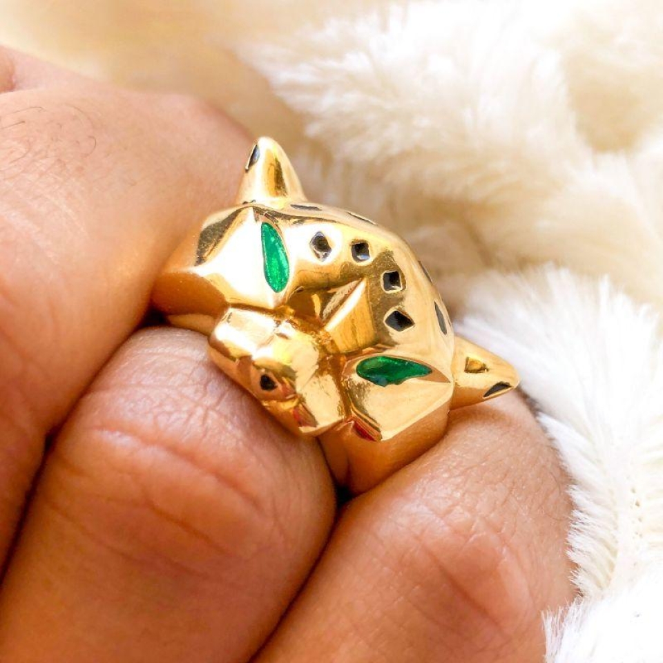 O anel possui acabamento dourado polido com detalhes esmaltados que destacam o rosto do felino. Os olhos em tom verde trazem um toque de cor e mistério à peça, enquanto os detalhes em esmalte preto valorizam o desenho e deixam o acessório ainda mais realista e exclusivo.