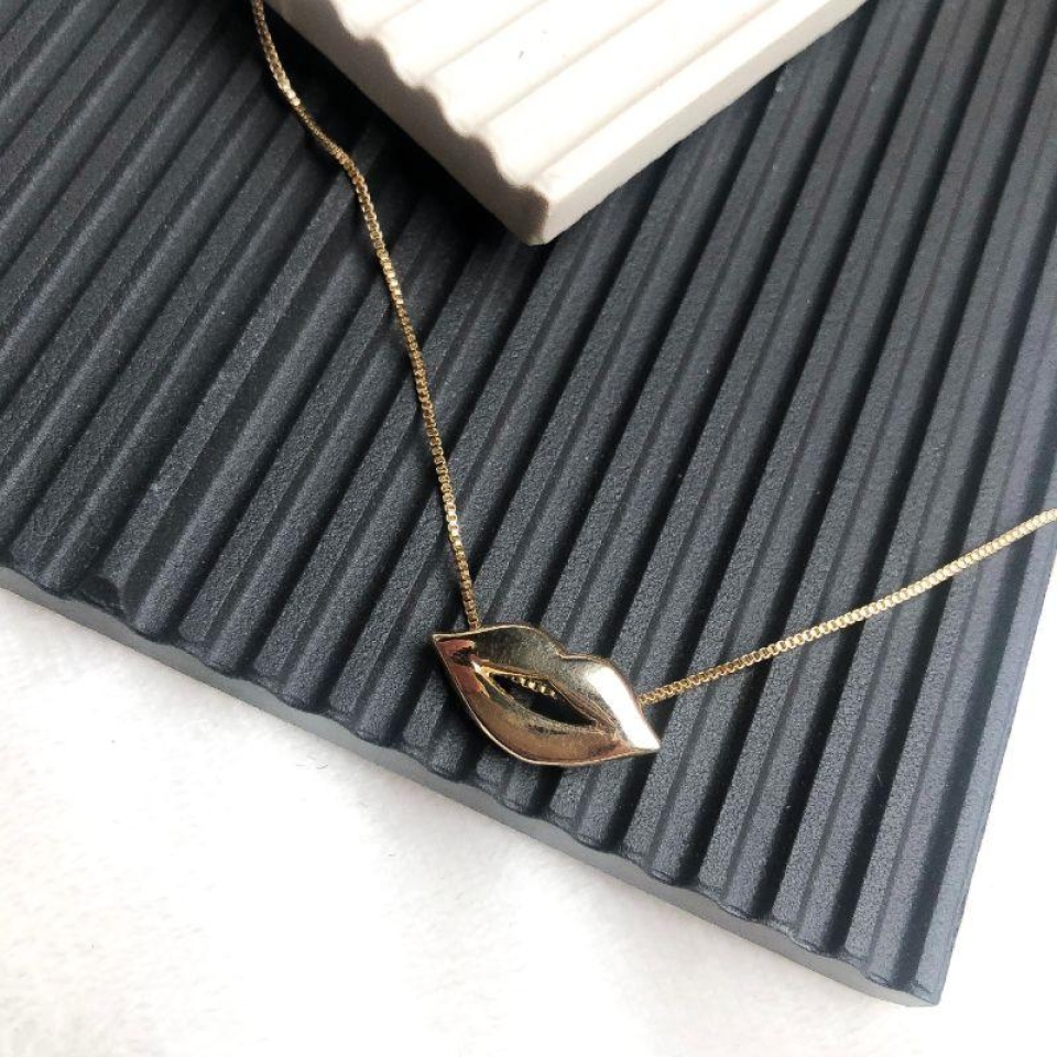 Seu pingente em formato de lábios dourados possui acabamento liso e polido, refletindo a luz de forma intensa e glamurosa. A corrente fina, também banhada a ouro 18k, completa o visual com sofisticação e leveza.