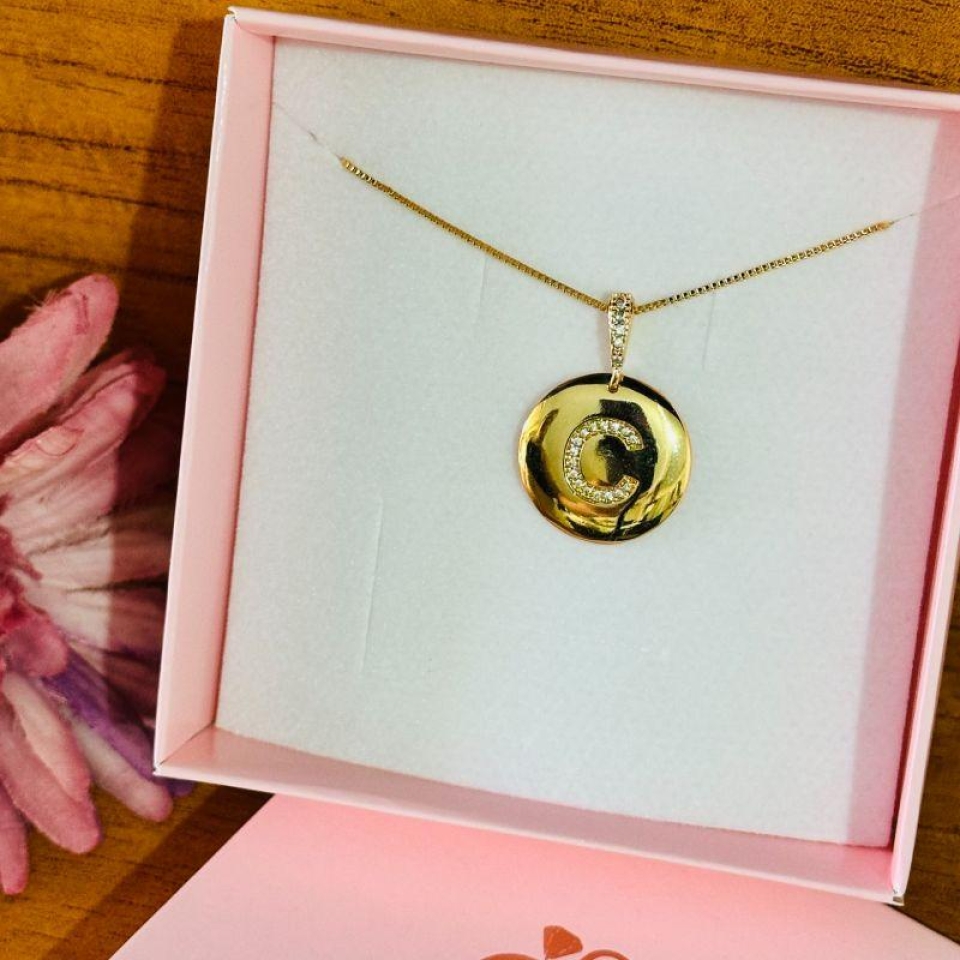 • Pingente em formato de medalha com inicial cravejada