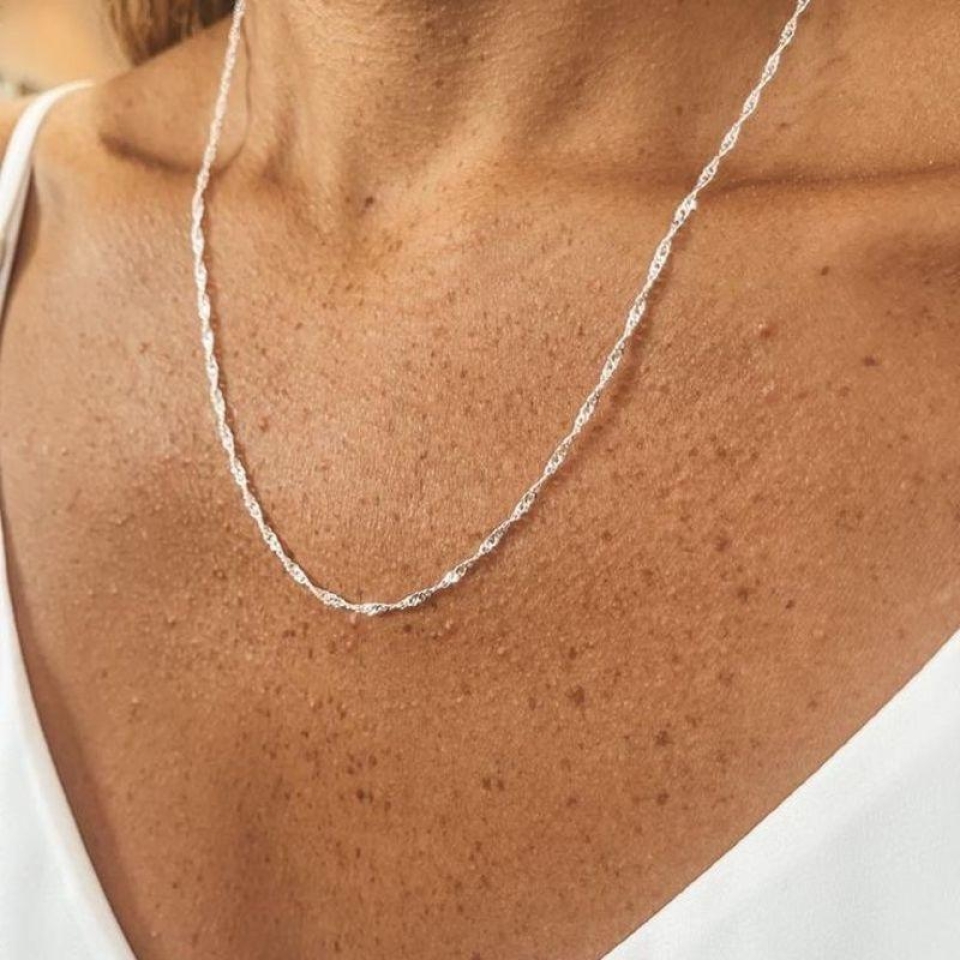 A corrente singapura em prata925 é a escolha perfeita para quem busca sofisticação com um toque leve e feminino. Seu design entrelaçado e torcido proporciona um brilho intenso e elegante, valorizando qualquer composição, com ou sem pingente.